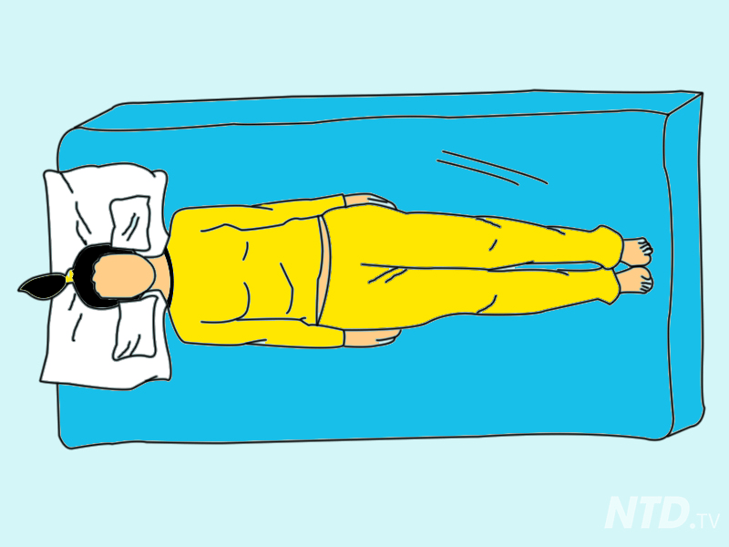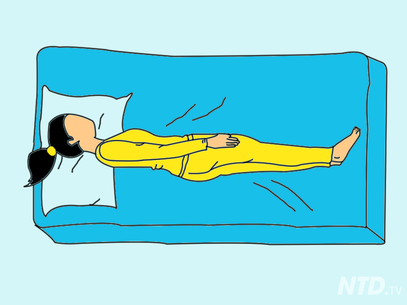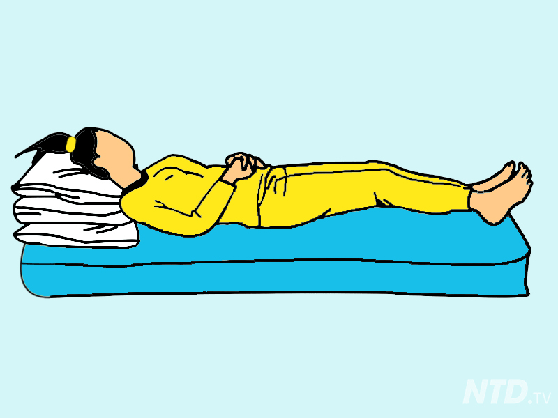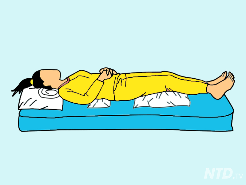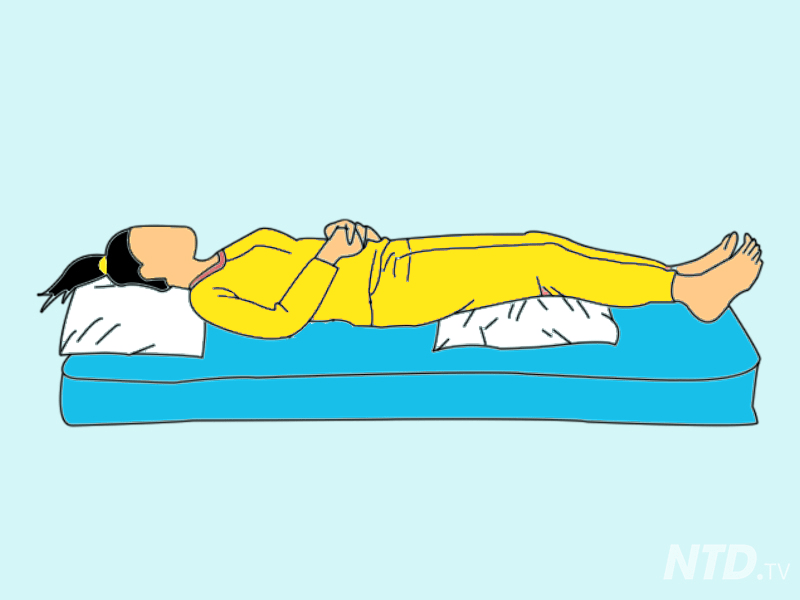 Sekiranya anda mengalami sakit belakang, posisi tidur begini baik untuk anda. Hanya perlu baring menelentang dan letakkan bantal di kaki dan bantal kecil di bahagian pinggang. Anda boleh juga meletakkan tuala kecil yang digulung menggantikan bantal kecil di bahagian pinggang.